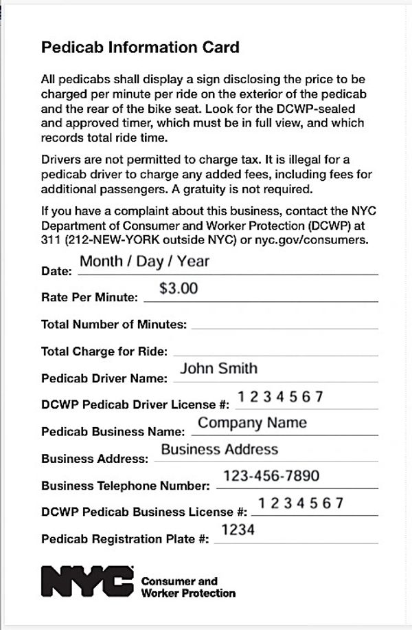 There should be a DCWP STICKERED TIMER facing the passenger. Remember to check for the driver’s DCWP license and the posted rates. The price of pedicab rides must be calculated per minute using a DCWP inspected timer but you can demand a flat rate for your entire ride (such as a tour). Pedicab drivers cannot charge tax, increase the price for additional passengers, or add other fees without your prior knowledge, and they must give passengers the official Pedicab Information Card BEFORE the ride begins.